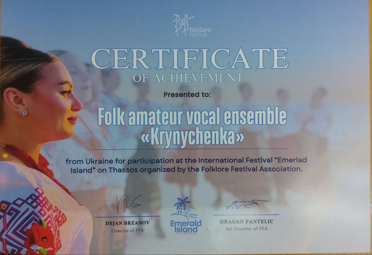 Народний самодіяльний жіночий вокальний ансамбль «Криниченька» Уманського національного університету під керівництвом Наталії БРАСЛАВСЬКОЇ став справжньою перлиною мистецтва серед Егейського моря, гідно представивши університет і Україну. Українська пісня у виконанні талановитих вихованців Центру культури і мистецтва звучала життєствердно й емоційно, викликаючи щирі овації, бурхливі оплески та феєрверки на честь наших артистів.