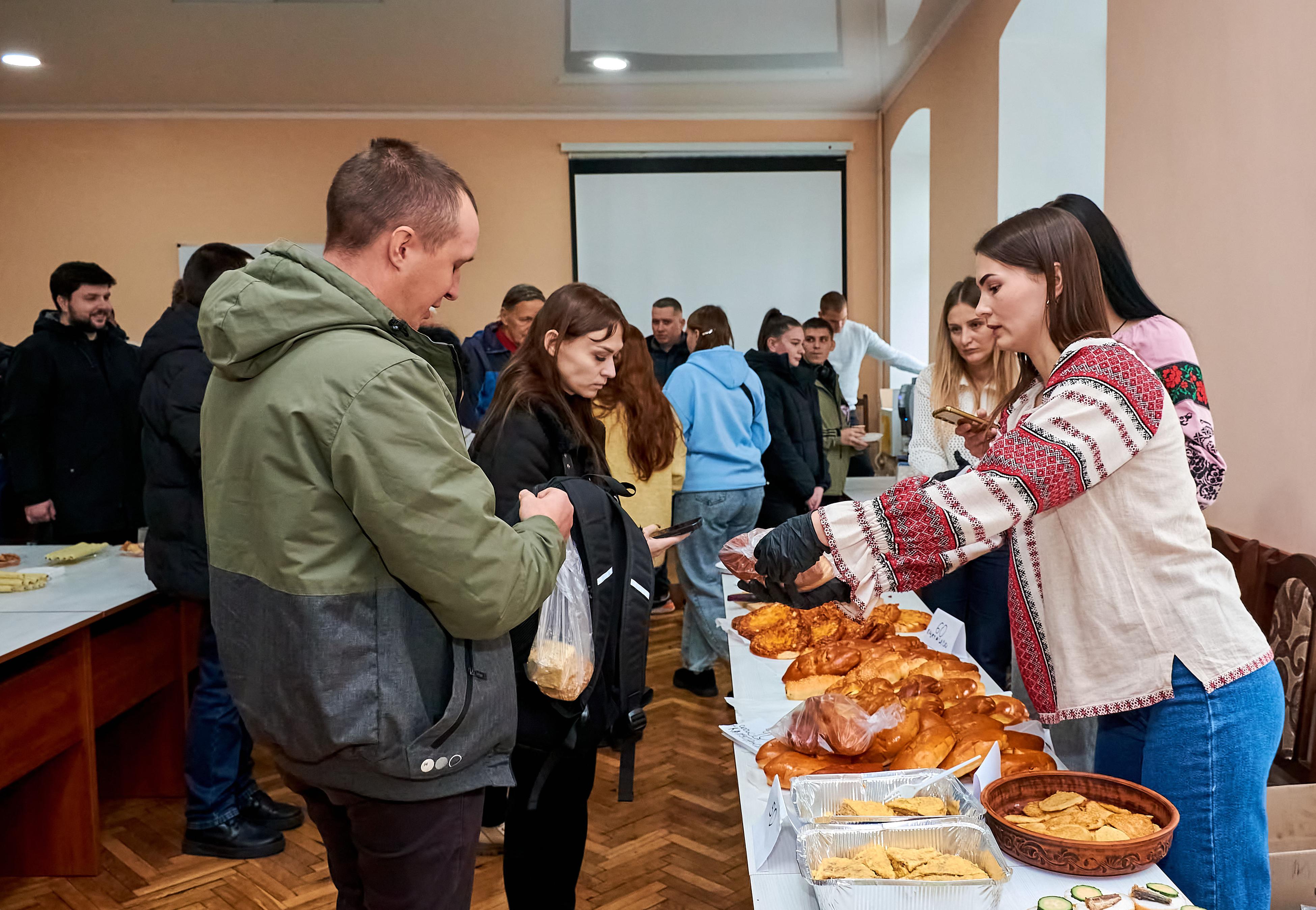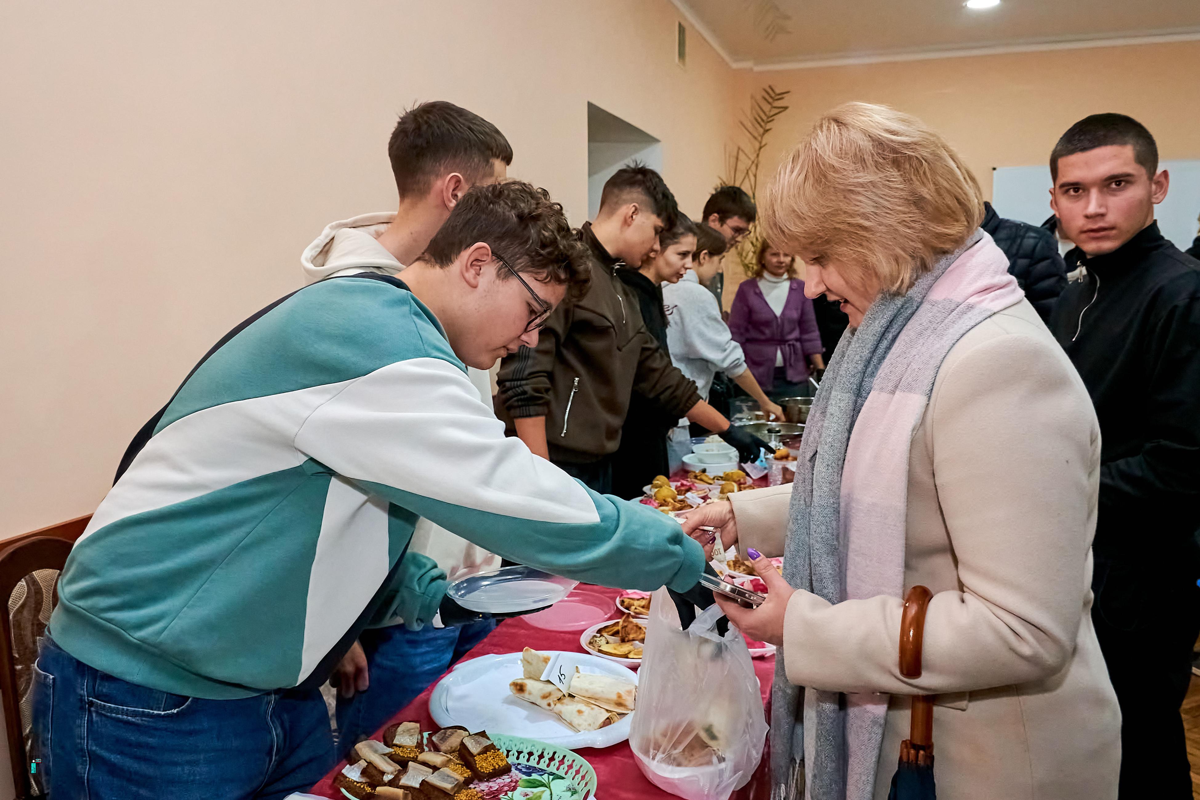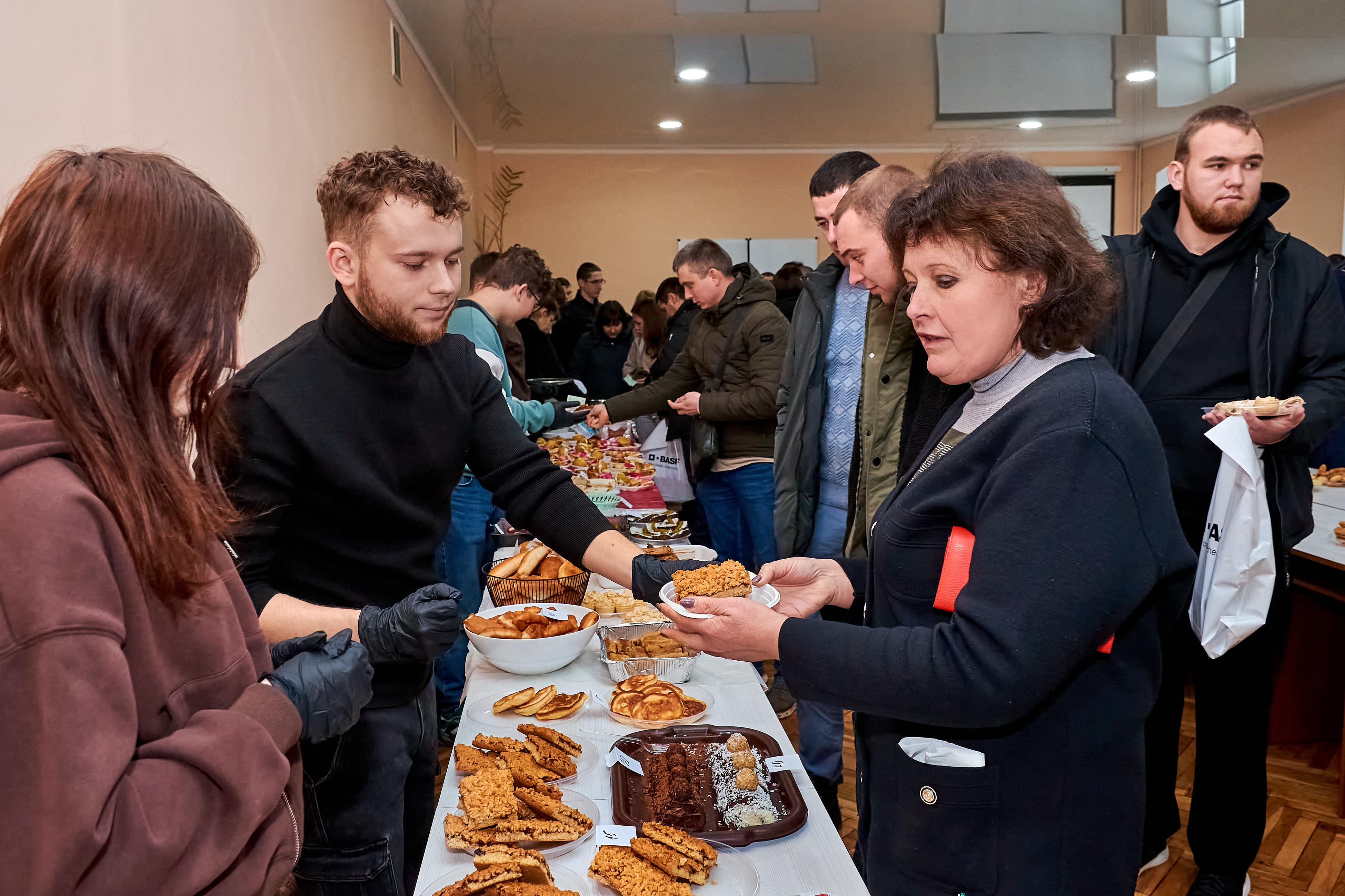 На ярмарку гості мали можливість скуштувати домашні смаколики. Голубці, вареники, деруни та інші українські страви, приготовлені власноруч студентами, викликали неабиякий інтерес та апетит у відвідувачів. Під керівництвом наставників і викладачів молодь охайно фасувала у пакунки торти, тістечка, еклери, пироги та рулети. Гості ярмарку із задоволенням смакували частування прямо біля столів зі стравами.