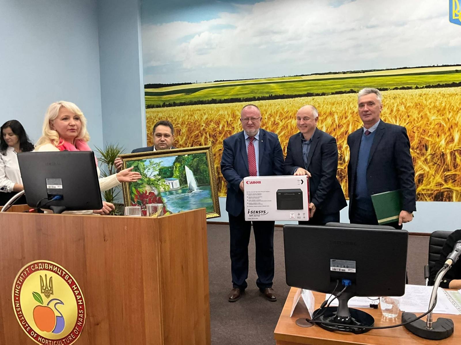 Уманський національний університет представляли виконуюча обов’язки ректора Владилена СОКИРСЬКА, перший проректор Іван МОСТОВ’ЯК, декан факультету агрономії Сергій ПОЛТОРЕЦЬКИЙ та декан факультету лісового і садово-паркового господарства Валентин ПОЛІЩУК. Вони привітали колектив Національного наукового центру зі славетним ювілеєм, подякували за вагомий внесок у розвиток аграрної науки, збереження і примноження наукових традицій, багаторічну співпрацю у сфері науково-дослідної діяльності, підготовки фахівців та впровадження інновацій у сільськогосподарське виробництво.