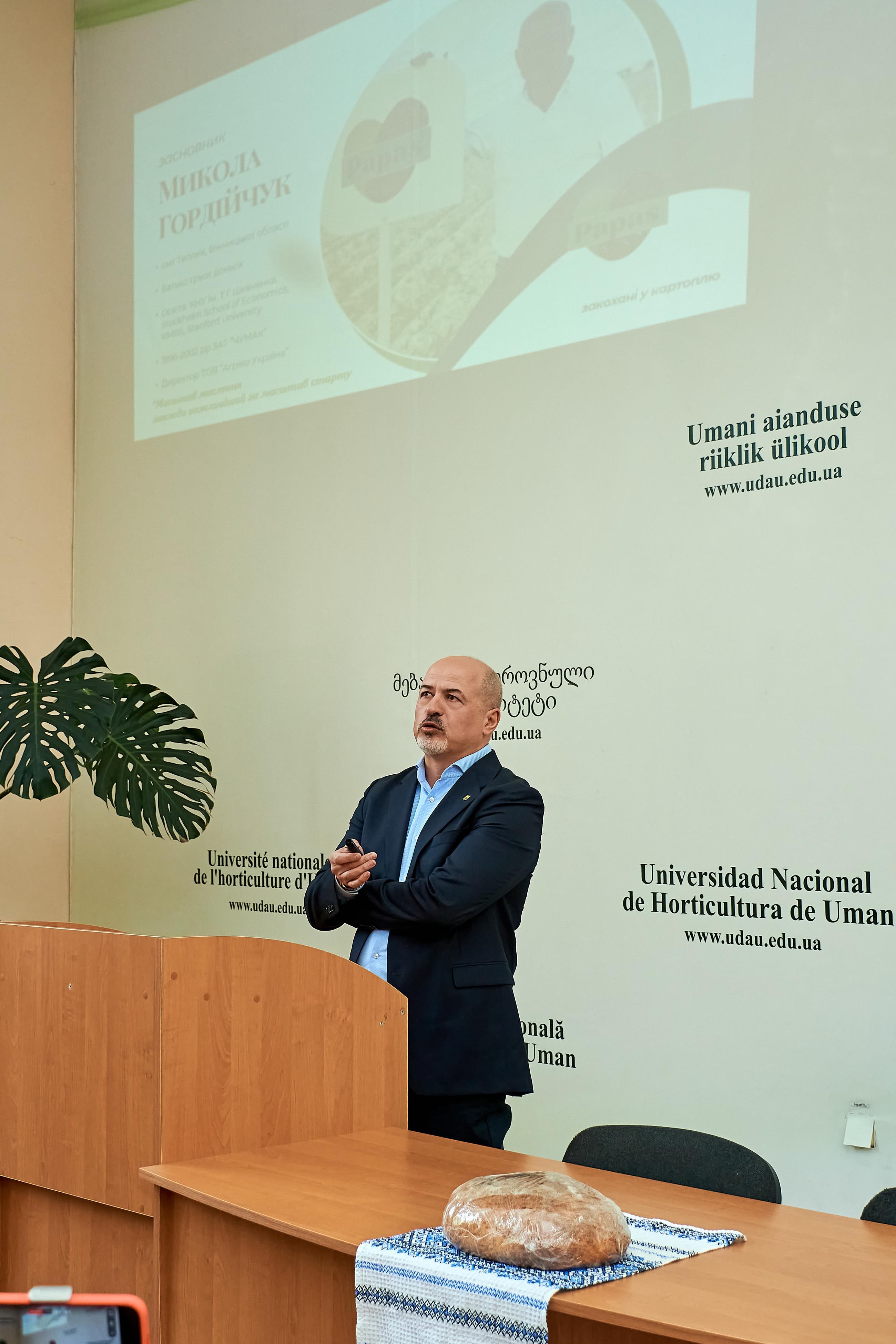 Першим спікером проєкту став Микола ГОРДІЙЧУК – засновник Української асоціації виробників картоплі, директор компанії «Агріко Україна», яка є лідером на ринку імпортованої та вирощеної в Україні високоякісної насіннєвої картоплі. Під час лекції він поділився власним професійним досвідом у сфері аграрного бізнесу, зокрема розповів про особливості вирощування картоплі та розвиток аграрного підприємництва в Україні. Спікер підкреслив важливість налагодження ефективного діалогу між освітою та ринком праці, а також формування у студентів сучасного бачення бізнес-процесів і підприємницького мислення.