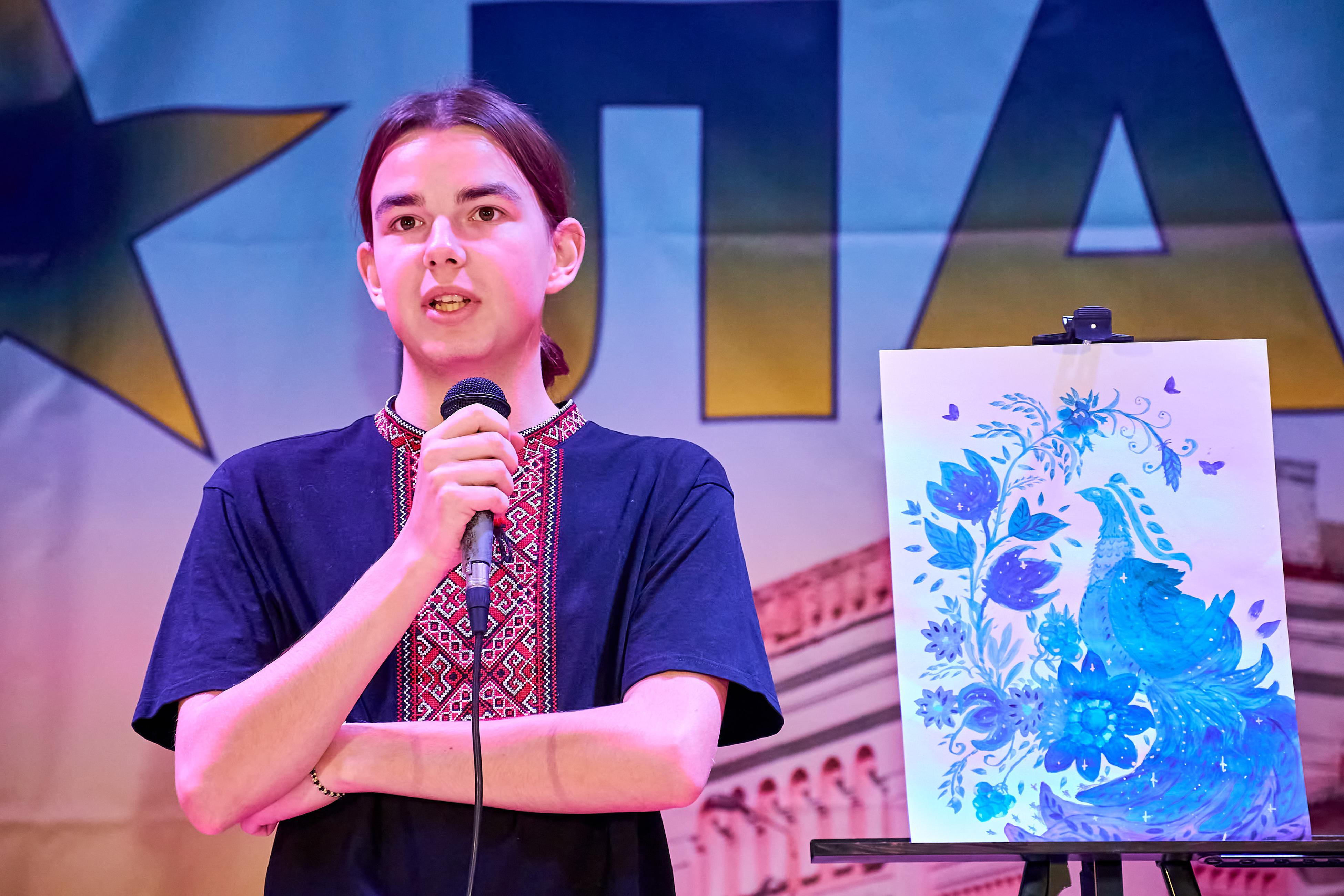 Ілля ТОПОЛЬ вразив загал вмінням відтворити техніки петриківського розпису, які базуються на використанні природних матеріалів, саморобних пензлів з котячої шерсті, пальців, стебел та трісочок, а також на прийомах «витягування» тонких ліній та «перехідних мазків» для створення яскравих квіткових і рослинних мотивів.
